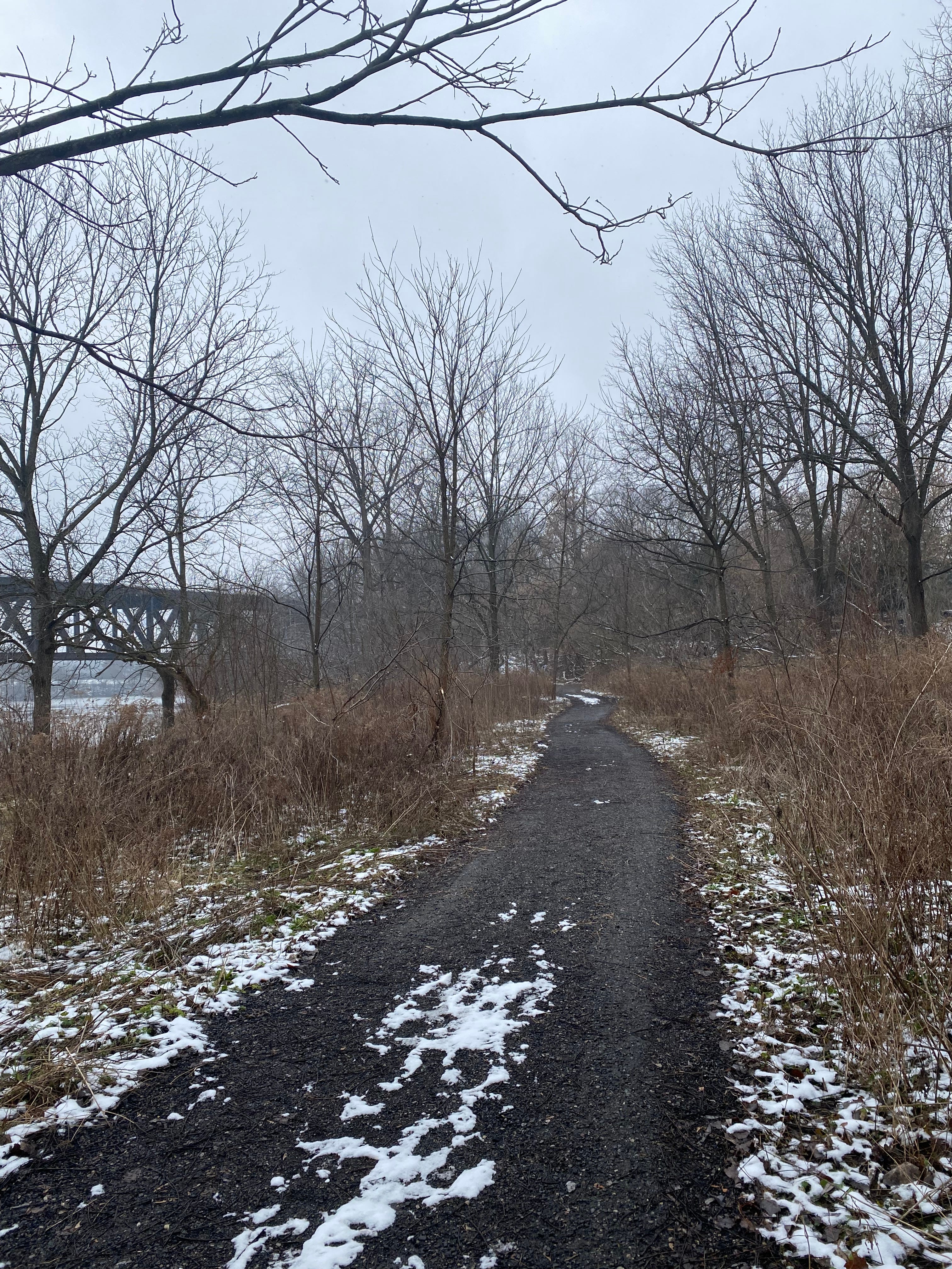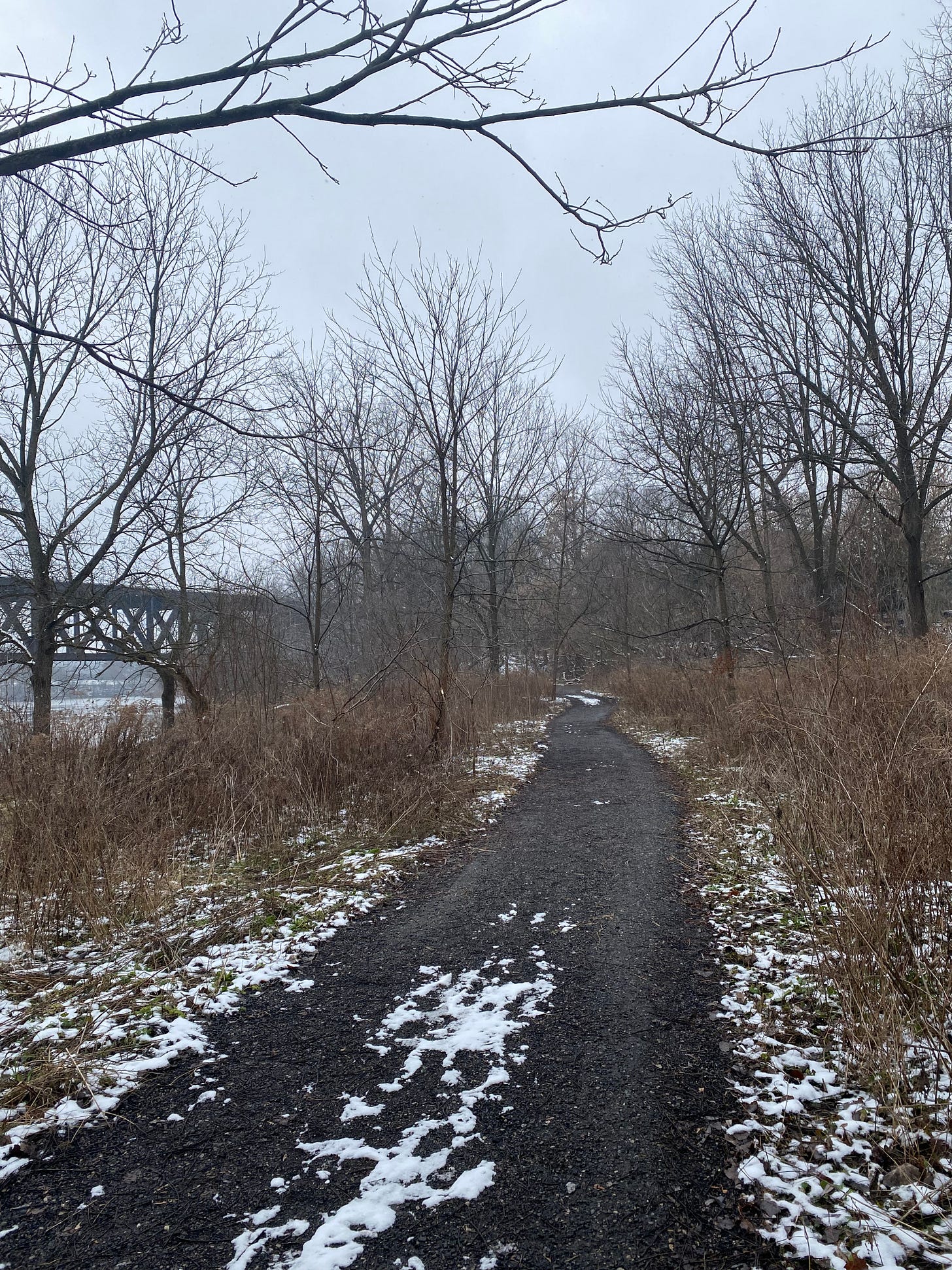 So off I went, following the twists and turns of the trail without distraction or intention—no phone, no music, no nothin’—just the rhythmic crunching of fresh snow and fallen leaves under my boots, and the huffing of my breath for company.