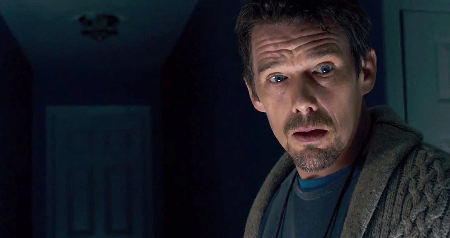 Immediately suspicious that her husband has been less-than-forthcoming about the bona fides of their new abode, she asks Ellison (played by Ethan Hawke), “Why was he pointing at the house? Ellison, we didn’t move in a few houses down from a crime scene again, did we?”